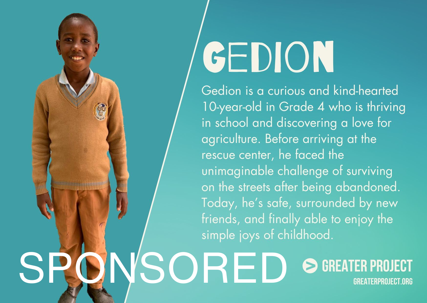 Use the slider on the this image of Brian to see just how much a sponsored child is positively affected. You can't help but see the good work Greater Project sponsors make. Brian's sponsor changed his life forever and you can change the trajectory of the life a child also.